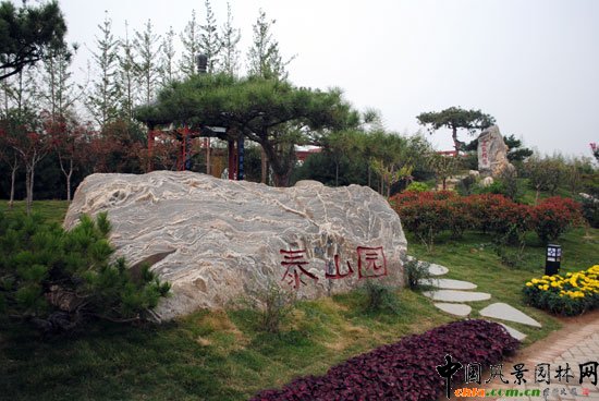 第七屆中國(青州)花博會國內展園泰安園,景園題名“泰山園”。“泰山園”以展示泰安苗木花卉產業發展為主題,以泰山文化為主線,用特色景觀意境和植物語言,從泰山石文化、詩詞文化、帝王文化等不同層面,展現了五岳之首博大精深的文化積淀。以泰山臥石為園門,沿山路布置了八塊泰山風景浮雕,配備了郁郁蔥蔥的泰山松。用泰山松和泰山石,表現泰山的人文精神——“松石為骨”。園內山頂制高點上,安置了泰山五岳獨尊石和泰山景松,體現“國泰民安”。山路中央設置了“望岳亭”。亭頂為圓形,與五岳獨尊石遙相呼應,表達了“天圓地方”的傳統文化理念。山路設三處臺階,象征泰山的“天、地、人”三重空間;九級與五級臺階,象征泰山“九五至尊”的崇高地位;十二級臺階,隱喻歷史上十二位帝王封禪泰山。園內植物以銀杏、白皮松、凌霄等為襯托,圍繞泰安市花——紫薇,合理布局,表達了泰安經濟文化發展的花團錦簇,生機盎然。