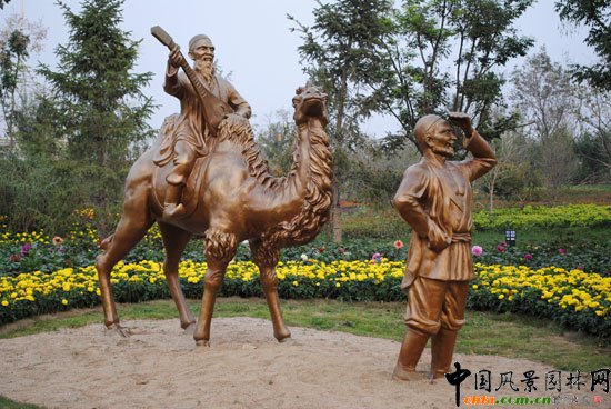 其中,甘肅園,“絲路明珠園”,來自絲綢之路上的圣地——甘肅。這里集中了甘肅境內閃光的文化亮點,采用典型化的造景藝術,在突出絲路文化的同時,又以舉世聞名的敦煌佛教文化為主景,以人類奇跡——長城文化為襯托,以紅色大麗花和黃色萬壽菊為素材,鋪設了一條多姿多彩的絲綢之路。這也是流暢通達的經濟之路、文化之路和友誼之路。這面生動的浮雕墻,描繪了長城腳下的金戈鐵馬和萬里雄關。夢回駝鈴表現的是,莫高窟、嘉峪關、麥積山石窟、戈壁紅柳、大漠駝鈴。它們共同展示了,當年絲路商貿的繁榮和隴原的名景風貌。也體現了現代甘肅人民喜迎四海賓客,廣交五洲朋友的美好愿景。