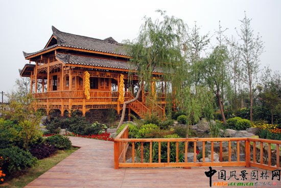其中貴州園,貴州居住著數量眾多的苗族同胞。他們靠山而居,農耕為業。古往今來,聚集了眾多的苗族村寨。最具代表性的有“西江苗寨”和“郞德上寨”;最具原始風格的有“岜沙苗寨”,其建筑風格多為結構二層建筑。貴州景園以最具苗族建筑風格的吊腳樓、美人靠、門樓、歌坪、水榭等景觀,集中展示了靠山而居的貴州苗族民居文化。整個景園采用寫實手法,營構了清麗、淡雅、幽靜的藝術氛圍,令人過目不忘。貴州景園冠名“大山之鄰”,是指貴州苗族同胞與大自然不可分割的優秀環保意識。