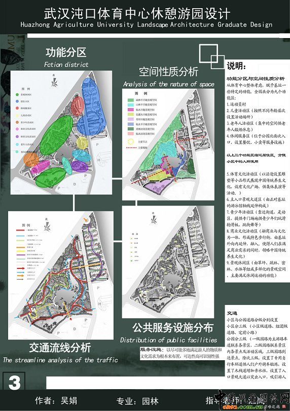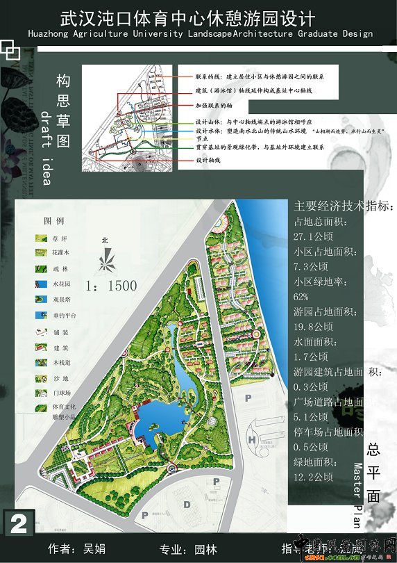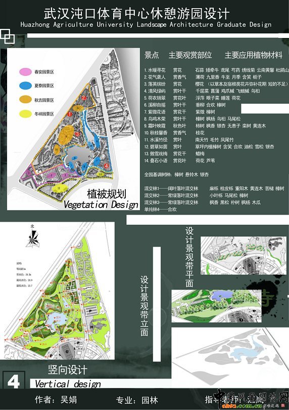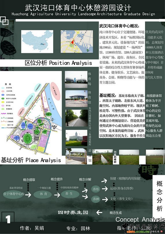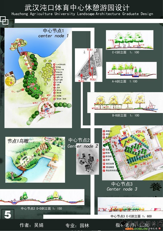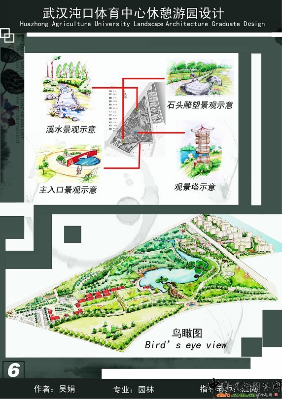 中國風景園林網訊 本設計是中國風景園林網的畢業生系列作品展作品之一,來自華中農業大學園林系08屆畢業生。 武漢沌口體育中心休憩游園設計 武漢沌口體育中心概況: 沌口體育中心位于交通經便捷、環境優美的武漢經濟技術開發區,本著“標準國際化、功能多元化、建筑多元化、設備現代化”的原則,總規劃用地1580畝,規劃建設“一場兩館”(60000人體育館、13300體育館、3200人游泳館)和五星級酒店、休閑廣場、超市、商務區、全民健身中心等配套設施。未來的武漢體育中心將成為華中地區首屈一指的綜合性大型體育賽事場所,并將形成融體育競賽、健身娛樂、文藝演出、旅游休閑商務、會展、購物等功能與一體的現代化大型體育主題公園。 <<<點擊圖片放大查看>>> ![]() ![]() ![]() ![]() ![]() ![]()
