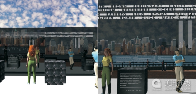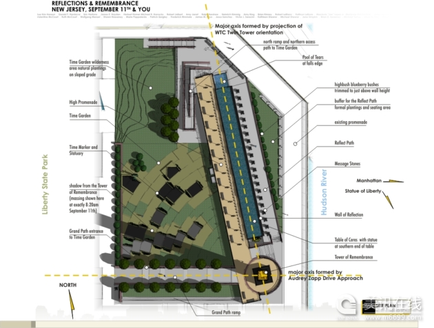 新澤西自由州立公園,座落在哈德遜河上,正對著自由女神像。2001年9月11日,曼哈頓區成為了美國近代歷史上一個重要事件的發生地,它已經成為一個重要的歷史界標。為了完整地表達出作為那個重要事件發生地的特點,新澤西自由州立公園將進行一系列的改造以此紀念該事件。紀念公園的設計理念就是為了給人們帶來一種交流式的紀念,設計包括了四個基本元素:深思之墻、紀念之塔、瑟瑞斯之臺和時間花園。這個紀念公園清楚地說明了:它是如此接近世界上最宏偉都市那不斷變化的天際。 深思之墻正對著紐約市,它由很多不同角度的暗色花崗巖板組成。板上每一幅畫都能讓聯想起恐怖襲擊當天這座城市的天空。雙子塔圖示的左邊空白的地方是兩個雕刻畫,能讓游客知道雙子塔所在的確切位置。 時間、陰影、五十個州和倒過來的紐約是最后三幅圖的組成元素,這些元素交融在一起給人們帶來強大的沖擊力。 ![]() ![]() ![]() ![]()