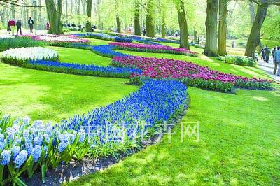 圖二:紅色、粉色等暖色調(diào)的郁金香與藍(lán)色等冷色調(diào)的風(fēng)信子諧調(diào)搭配,營造出色彩豐富、形狀各異的花帶。