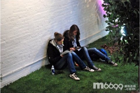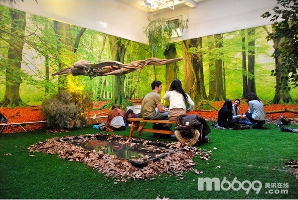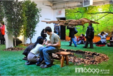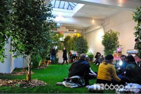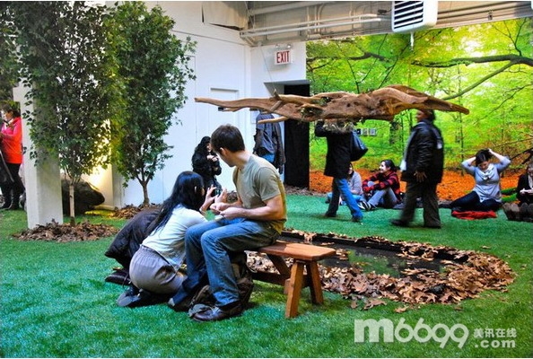 這個室內公園位于紐約的OpenHouse畫廊的展廳內。公園里面擁有所有普通公園有的一切。這里有真正的綠色草坪、幾張長椅、一處不大的用石材建造的人造池塘、真正的樹、巨大的石塊和兒童游樂場。所有的這些都集中在幾十平方米的室內空間里,墻壁上黏貼的是真正的公園風景。因此人們置身其中就仿佛身處一個大公園內一樣。