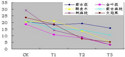 金葉蕕、柄扁桃和文冠果自由水含量下降幅度較大,醉魚木次之,蒙古蕕和蒙古扁桃變化最小;