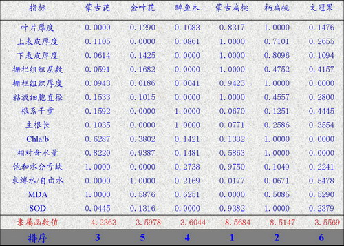 相比較而言,蒙古扁桃和柄扁桃的抗旱能力最強,隸屬函數值為8.5;蒙古蕕次之,其隸屬函數值為4.2;醉魚、文冠果和金葉蕕的抗旱能力大體相等,其隸屬函數值為3.5~3.6 。