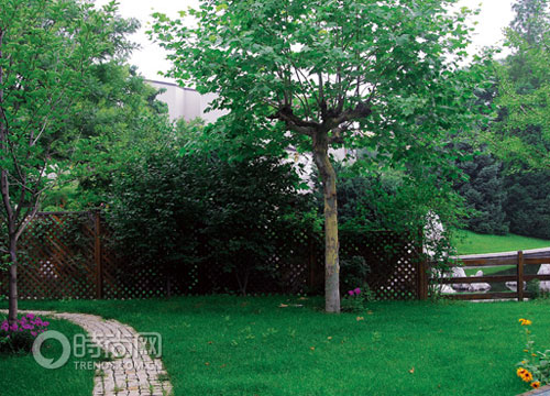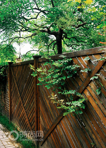 密而有隙的木柵欄,水平與斜線組合,既豐富了線條又阻斷了路人的視線。適合地錦(俗稱爬墻虎)攀爬,是造價適中的方法。