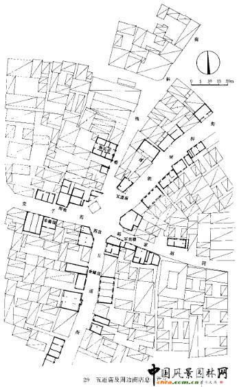 1 前言 五道廟 ![]() 圖1.1 五道廟地區平面圖(70年代測繪) 五道廟位于北京市宣武區大柵欄地區西南部,櫻桃斜街、鐵樹斜街、韓家胡同、五道街、堂子街五條街巷交匯之處的北部,門牌為鐵樹斜街149號。 可證最早的五道廟應形成于明中葉以前(一說建于萬歷三十五年(1607)),位于當時北京的郊區。此廟的位置、格局、式樣都與鄉村路口的五道、土地廟相似,而與城市廟宇格局不同。現存的五道廟為清中葉后的建筑。 明兵部尚書王象乾曾撰文,立"交龍碑",稱此地為正陽、宣武二門之"龍脈交通車馬輻輳之地",應以廟鎮之,故建五道廟。另有一種說法,此廟是明代太監為宦官魏忠賢所建,此廟今尚存。1965年將五道廟頭條、二條并入,改為現名。 按照道教說法,五道將軍是東岳大帝的屬神掌管世人的生死與榮 祿,是陰間的大神。古典小說中的五道將軍似乎可以代閻羅王決定世人壽限。但與閻羅王不同的是,他頗具同情心,能幫助、成全弱者實現自己的理想,是個具有正義感的冥神。 五道廟就其名稱來說,應供有五道將軍,而非指"五條道的交叉處"。不知何故,一些文字資料和傳說均未提及,故不敢確定。 五道廟廣場 ![]() 由于櫻桃、鐵樹兩條斜街貫穿了金中都舊址至元明清都城之間的地區,附近又有楊梅竹斜街、廠甸和八大胡同等繁華地區,因而此處成為交通要道的樞紐,是北京獨有的斜街及五條街巷的交會處,歷史上被稱為龍脈。以五道廟為中心形成的一處不規則形狀的小廣場正位于這條龍脈的中間地帶,五道廟則是龍脈的標志點。 圍繞著五道廟廣場的一批商業建筑,形成一個特殊的商店群。從八大胡同的位置看,五道廟位于其所有胡同的最西端,再向西就到了南新華街上。可以說這兒是八大胡同的起點也是終點,所以這兒集中了飯店、賭場、藥鋪等,今天還可以在其北口路西看到日本人開的藥鋪上的牌匾。 受廣場地形影響,五道廟平面呈不規則梯形,這里的店鋪格局也多不規則,隨形就勢誘發出一些很有意思的小角落。 在五道廟地區可以發現宣南地區近代建筑的各種風格,但手法要簡單樸素的多,反映出這一帶店鋪的服務對象還是一種下層平民為主,店主的財力遠不如其東面的廊坊頭條和大柵欄的商家。而恰因如此,這里顯得更接近生活,更有人情味。 ![]() 自石頭胡同而西曰陜西巷,光緒庚子時,名妓賽金花張艷織于是。其后為醉瓊林食肆,其間小胡同曰萬佛寺灣。又西曰大、小外廊營。稍南曰韓家潭。再南曰百順胡同,曰東皮條營、西皮條營,今改作東壁營、西壁營。又南曰胭脂胡同。又南即虎坊橋大街。韓家潭之西曰小百順胡同。又西曰后河,曰五道廟,北接李鐵拐斜街,南達南新華街。 明王象乾《建玉帝殿碑記》:正陽門西,又臧家橋至宣武門,乃龍脈交通車馬輻轍之地,舊有五道廟鎮焉。其址廣不數五,天中羽士揭真誠者見之喟然曰:沖衙應建玉帝行宮,率諸神威鎮之斯可也。經始于萬歷三十五年七月,次年告成,乞言于予。文成即以交龍名碑。 《燕京訪古錄》:韓家潭西口有兩斜街,其東名李鐵拐,其西名為櫻桃,界其間有小剎數椽,顏曰五道廟,有明王元美先生為此處為正陽、宣武龍脈交接點,故立廟以鎮之。或曰廟系明系諸閹為客魏所建以祈福者。及工成,乃求某名流為為撰碑志其事,意在得其言以媚客、魏。某居權威之下,不敢辭,譽揚之又非所愿,乃率筆書曰:"夫五道廟者五道之神也,人以為樹在廟前,我以為廟在樹后,何則?請列芳名。"閹等不及文義,以為出自名手,即是佳構,乃選名工刻之于石,而樹于廟中,今尚存焉。按:此碑文亦曾見于他處記載,予曾親訪未得。 --《燕都叢考》陳宗蕃編. ![]() 1.2 現有市政規劃方案 五道廟地區屬于宣武區 "琉璃廠文化產業園區"規劃一期工程中的重要部分。 規劃中的琉璃廠文化產業園區東起延壽寺街,西至南柳巷,總面積一平方公里, 總投資預計超過100億元。其中將改造一個中心區,兩個標志性建筑,四個文化專業區和八個文化商業專賣街。 一期工程總占地約6.3公頃,主要包括拓寬南新華街、修繕五道廟廣場和改造東琉璃廠等。 南新華街改造后道路由12米拓寬為34米,雙向四車道。同時,還將沿街新建8組具有民國初年風格的建筑群,并對京華印書局、老北師大校園等沿街7處歷史文物建筑及歷史保護街區的建筑進行保護和修繕。 五道廟則需重新修繕,在五條街的街口處新建一座廣場,并改建部分舊建筑,以"民國"風格為主,與南新華街相呼應。