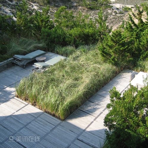 由于人們不容易看到壯觀的自然景觀,這樣創造出仿自然的景觀就顯得格外有意義。我們居住的地方也不例外。大自然的精髓在于其本身就是最了不起的景觀。在這棟海濱別墅,最令人稱道的特征即是它的沙丘地貌。 這棟別墅被修建在一片松軟的沙丘之中,設計師Dirtworks為了使它融入自然之中,只有盡量輕地與沙丘接觸。又出于生態方面的考慮采用了以下方式:為了防止砂蝕,設計師們重新配置了本土植物,使其根部緊密相連,最大化不滲地表水,保存地下水,在建設過程中穩步處理沙丘生態破壞問題。這樣的設計只有一個含義:我們作為永恒的生態系統中的一份子,要時時刻刻注意保護環境。 這項工程的戶外生活區包括備餐、進餐、沐浴和臨時聚會的場所。標準的能抵御災害天氣的裁片板(pallets)把各個戶外生活區域彼此聯接了起來。延伸至沙丘的外露陽臺使建筑物與整個沙丘地貌形成整體。擋土墻的修建、臺階的鋪設和植物的配置都創造出一個緊密相連的私密空間,與原土地貌形成鮮明對照。
