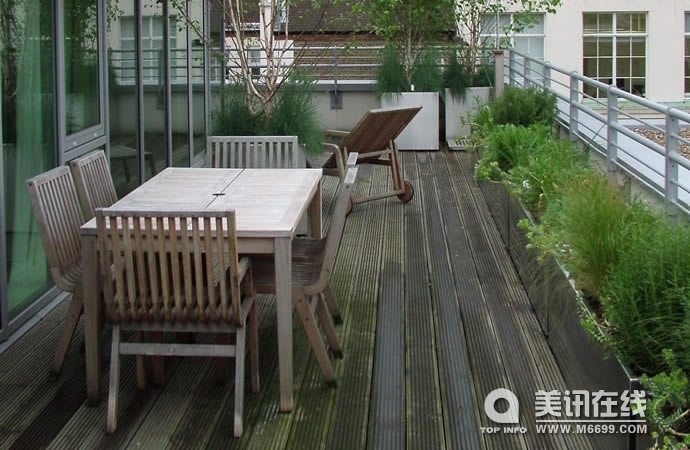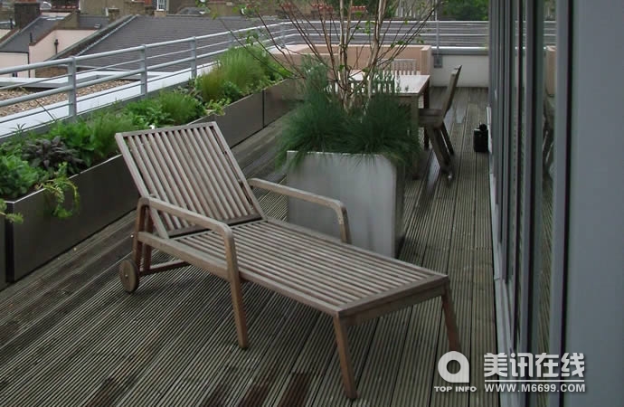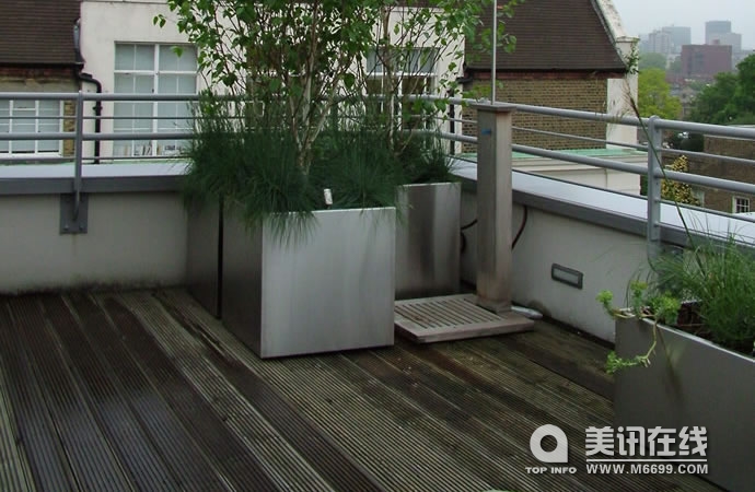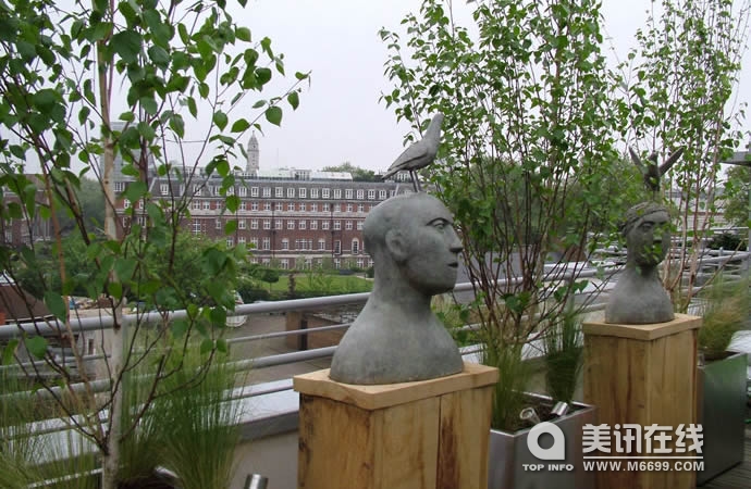 將原有的甲板頂層露臺變成一個(gè)讓人印象深刻的花園,不銹鋼槽的白樺樹和地下植物是這個(gè)露臺的主要軟景觀點(diǎn),露臺內(nèi)已經(jīng)安裝了灌溉和照明系統(tǒng),室外雕塑為整個(gè)露臺增加了個(gè)人風(fēng)格。