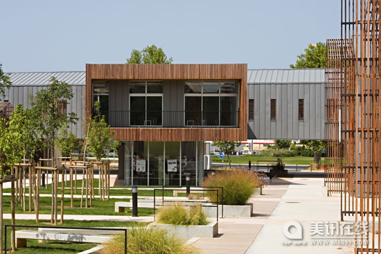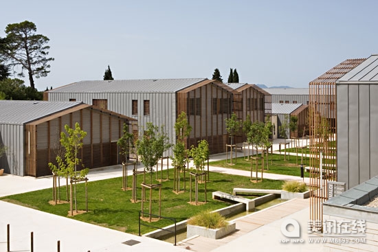 項目:實驗經濟活動區建筑物建設,Herault山谷社區中心 N+B事務所設計的Herault山谷社區中心位于日尼亞克鎮入口處。該項目包括眾多的建筑,形成一個村莊式的環境。每個建筑都可以通過獨立花園進入,讓每個實體都有自主權和一致性。主要的建筑是南北向,以提供自然通風。這樣設置的目的有兩個,一是保護來自北方的逆風來襲,二是保護中心花園。同時也為了保證從日尼亞克高塔上觀望有一個良好的景觀。社區的公社建筑的方向是一個垂直于其他建筑的特殊體,標志著面向城市的居民并且可以有權使用這個場所,也起到了保護內部花園的作用。其規劃是相互對稱的,統一的,模塊化的和可發展的。建設所用的材料中鋅,石料和混泥土是必不可少的,是為了與這個區域的傳統材料相適應。