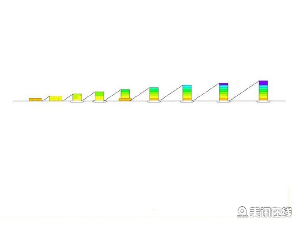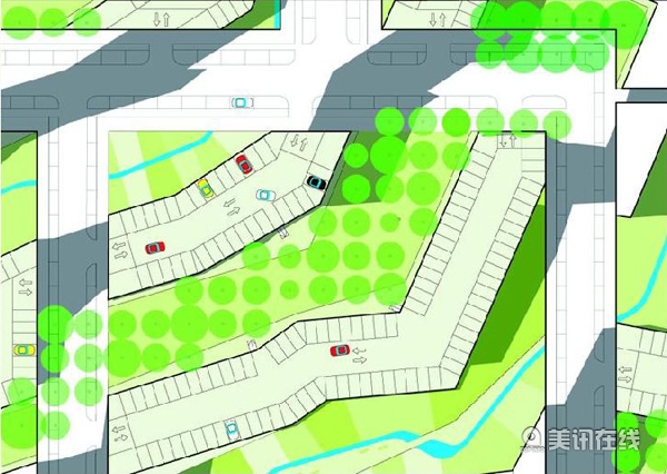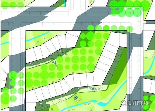 該住宅區設計不拘泥于嚴格的基建形式,建筑師們在對基地地質條件如(空氣質量、空間、風景、道路、噪音等)做了仔細的勘察并繪制了地質圖,然后再根據地質圖對基地進行了價值性區塊劃分,形成了這個住宅區的條理化構造,將住宅樓設置與風景優美人口密度大的地塊上,而將其他地方建設為空曠的休閑區域。