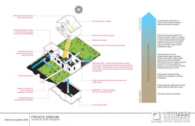 這個設計將廢棄的郊區住宅社區變為了濕地,用植被用于過濾和凈化從附近城市中心流入郊區的水。BLDGBLDG的作者,評委Geoff Manaugh說:“我非常喜歡這中跨物種方式,這種從經濟角度上的轉換近來已經在一些建好的郊區出現了。它富有詩意,雖然并不實用——但這個作品是我們對郊區進行重新思考的鮮明證據。”
