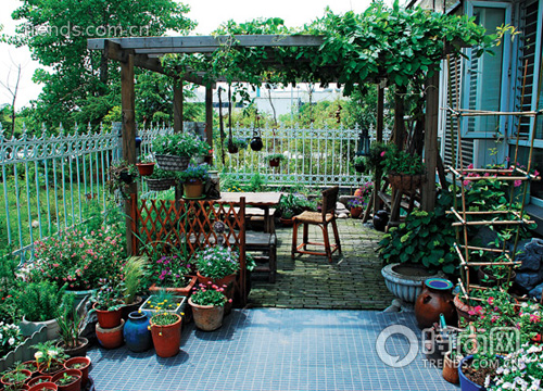 時下正流行的雜貨花園JunkGarden使舊貨得以煥發(fā)新的生機,也令花草綻放出藝術(shù)的氣息。 ![]() 從這里可以清楚地看到:青磚和地磚的地面鋪裝為長方形的花園起到了自然的分割作用。 古樸青磚奠定花園基調(diào) 在設(shè)計花園之前,主人對花園的理想是希望建一座無拘無束的浪漫花園。現(xiàn)在她的理想基本實現(xiàn)了。花園是沉靜的,這首先要歸功于花園的地面鋪設(shè),和常見的大理石或防腐木甲板鋪裝不一樣,主人采用了古舊青磚作為花園的地面。這些來之不易的青磚有著天然的歷史沉淀,它們來自老城區(qū)的老房子。 如今這些青磚帶著古樸落戶花園,為整座花園奠定了清雅古樸的基調(diào);它們在南方潮濕的氣候下,很快衍生出了淡淡的青苔,為花園更添一份幽寂感。有了青磚樸素的映襯,花草們則愈發(fā)顯得鮮艷生動。對于花園里花草的配置,主人很有把握,如何進行顏色搭配和協(xié)調(diào)也都了然于心,最喜歡的就是藍色調(diào)的花草,比如六倍利、千鳥草、藍雪花、特麗莎紫羅蘭、繡球現(xiàn)在還增添了勿忘我、同瓣草等等新上市的園藝品種。 據(jù)說這只扁罐先前看起來非常土氣,可是主人為它換上了藍色的裝束,頓時眼前一亮。