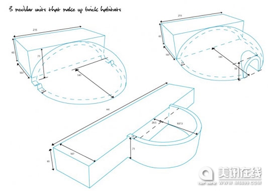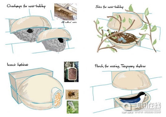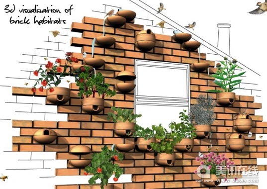 想象一下植物和動物住在你家房子磚塊里的場景!這是個幻想嗎?“磚塊棲息地”(Brick Habitats)可以實現這一點,磚塊上有一些小小的孔可以供植物生長以及鳥兒棲息,看見這個就知道不是一個幻想了。Reburbia競賽的大多數參賽者都使用了大膽、新穎的方法來重新規劃房屋和土地,而Brick Habitats的設計者Chooi-leng Tan的想象為郊區風景帶來了更加微妙的變化。這些在磚塊中的小洞穴像一個個獨立的房子,可以讓當地的植物在此生長,動物在此棲息。 Tan想象了一種輕松自定義的系統,可以使住戶按照自己的方式布置墻上花園。底部碗狀的磚塊可以使雨水流出,供鳥兒們飲用,帶有孔洞的磚塊可以供鳥兒們筑巢用,并且可以用來繁殖植物--這是一個對于任何一個想擁有自家的花園的人來說非常棒的方式。 這種方式易懂并且容易組合,磚塊棲息地是一個值得鼓勵的提案,可以使居民參與郊區動植物棲息地的重建,用他們自己的雙手改變環境。 ![]() ![]() ![]() ![]()
