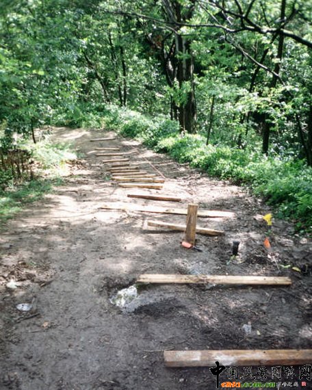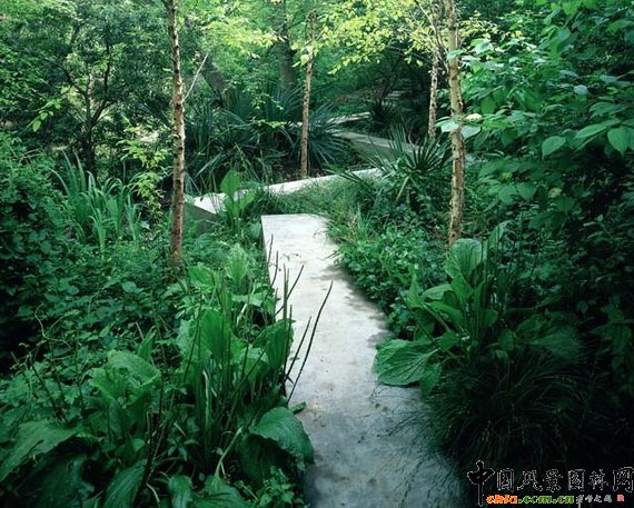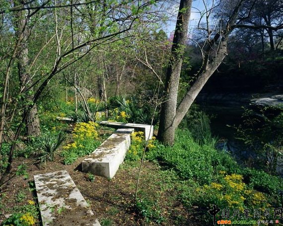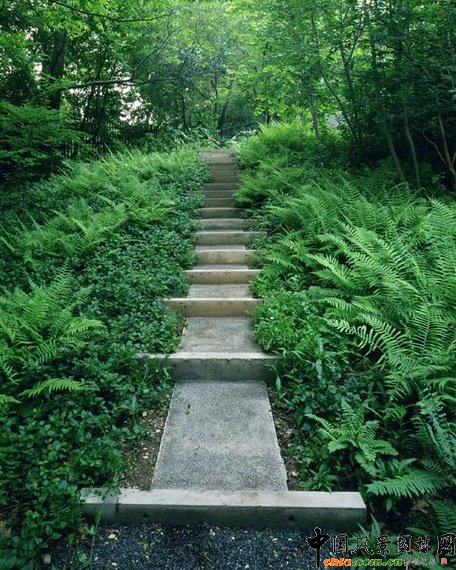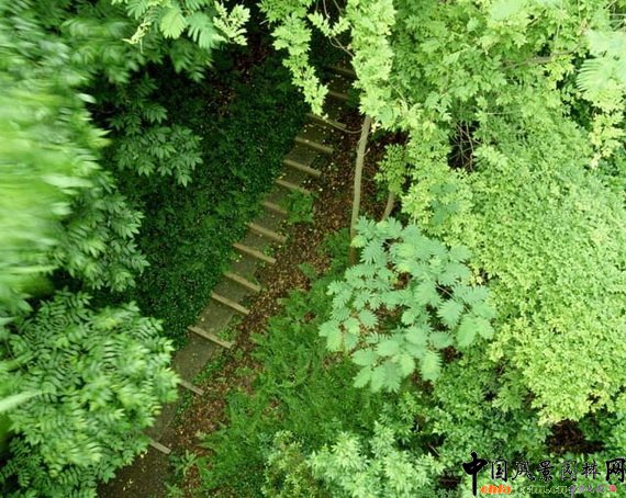 ![]() 位于南部邊界坡地的另外一條不同間距的踏步道路,也是為了尊重現(xiàn)有的樹(shù)木。