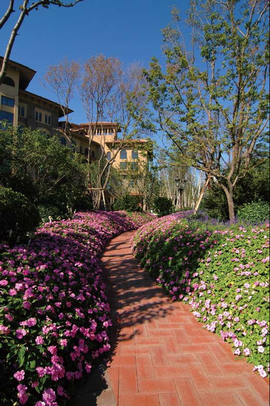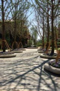 中心廣場 中心廣場區由泳池區,銀杏大道組成。泳池邊線采用弧形設計,中間設有小島,定義為玫瑰島,島上種植玫瑰及一株八棱海棠,是泳池的第一個亮點。西班牙式拱廊白色景墻,在后面云杉深綠色的背景下,景墻極為突出,5米高景墻上面作跌水及花池處理,依然種植玫瑰,紅色與白色交相呼應,營造一種浪漫、溫馨、自然的環境,是泳池的第二個亮點。泳池貼面材料,選用的是深藍與淺藍交替的玻璃馬賽克鋪砌而成,壓頂采用金麻黃荔枝面花崗巖;在壓頂的下面做了西班牙式的花磚腰線,賦予西班牙式泳池的特點;對于泳池入水的考慮,擯棄了傳統的水梯入水方式,而是采用了緩坡、階梯入水,由淺入深,滿足不同年齡人群的需要。 ![]() 藍色的水面,更加凸顯景墻的亮麗 ![]() ![]() 銀杏大道端頭的小水景 ![]() 銀杏大道,樹池采用荔枝面金麻黃花崗巖整石弧形加工而成 銀杏大道的處理以高差大臺階、圓形花池、花缽等體現錯落有致的景觀風格,透過銀杏大道,端頭用漢白玉砌成的小水景在陽光的照射下分外清新、涼爽。樣板房區的五重景觀樣板房區的景觀設計采用360度景觀定位,在高喬木、小喬木,灌木、低灌木,以及近地花卉及草地的掩映下,呈現高低錯落的五重景觀。在宅間,每戶種一棵大型的園林庭蔭樹,道路兩旁由桃樹統一,在不同色彩的樹木及花卉的映襯下,人們可以從不同角度感受四季變化的完美景致。自然生態林區自然生態林區包括疏林草坪、白樺林及生態溪流區。在這里我們既可以感受到大場地、,大視野的寬闊景致,又可以感受到小場地、小空間的精致小景。