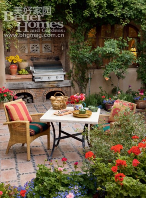 綠植環繞沿著房子邊的涼亭上耷垂著攀緣薔薇、柑橘樹、迷迭香、盆栽天竺葵和半邊蓮擠滿院子。