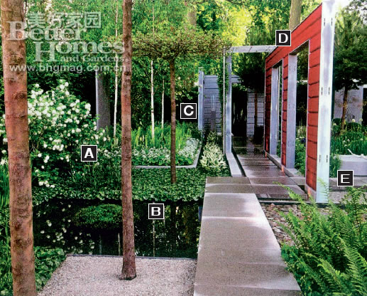 ![]() 2.植物多樣的瑞典風情 瑞典植物學家卡爾·林涅伊斯設計的庭院富含植物多樣性,不但具有典型的瑞典風格,更混合了新古典主義和現代主義的諸多特征。 注意到他所采用的典型瑞典植物、瑞典水系設計風格之后,你絕對不會懷疑這座庭院的設計創意來自一個瑞典人。 A.紫色的鳶尾花、烏頭和西伯利亞耐寒牛舌草聚集在花叢中,間或夾雜著散發著濃郁香氣的百合花和不起眼的毛地黃。 B.這是一片帶著懷舊感覺的嚴寒帶林地,水系滴滴流淌,環繞著這片疏闊的空間,滋潤著周圍金黃色的鐵線蕨,最后匯集到一方小小的池塘中,被鵝卵石分流成更為細碎的支流。 C.云杉和針葉松形成了這片疏闊空間的自然屏障。數量不多的野蘋果樹點綴其間,豐富了植物的層次。 D.庭院中的花墻將整體面積區分為幾片不同空間,各個區域之間的干濕度、采光度都有很大的不同。花墻被粉刷成紅色,并配有灰色的鑲邊。這些都是在瑞典鄉村非常常見的顏色搭配。 E.挪威藝術家安妮·卡瑞恩特地為這座庭院設計了一組藝術作品。據說她的靈感即是在和設計師的交談之中獲得的。