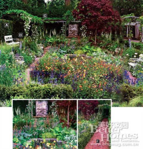![]() 3.下沉庭院,易于打理的美景 園藝是一門結合了浪漫和實用的學問,二者看似矛盾,卻又必須在一座花園中得到和諧地統一。嘉伯瑞拉·佩吉和伊莎貝拉通過對這座下沉花園的設計,成功找到了浪漫與使用之間的結合點——既優雅美觀、又易于維護。 A.下沉式花園的四周栽滿了紫杉、筆挺的樹干和濃密的枝葉將這片園藝空間和周圍隔離開來,形成了一方獨立的天地。 B.庭院中的長凳和座椅圍繞著花園四周錯落有致地安插,為游賞者提供了充足的休閑空間可以“坐看云起時”。 C.紫藤和玫瑰攀緣在金屬格架上,形成了一個U型的涼亭。庭院中央的金屬雕塑位置醒目,很容易集中人們的視線焦點,并且和后方的西洋杉形成了和諧的搭配。 D.喜歡潮濕、耐得住干旱、在陰暗的環境下也能茂密生長的植物應該在庭院中兼而有之。顏色、形狀、層次對選擇要栽種的植物來說都是重要的參考系數。 E.庭院中長方形的池塘是整個空間中的點睛之處。它同時也承擔著為庭院中的植物輸送水分的重要只能。 F.園中小路使用了可滲透的地磚材料,可以讓雨水浸入下面的泥土中來代替水溝。道路上面的高處是灌木植物景天,地面鋪裝則是成塊的意大利花崗巖。