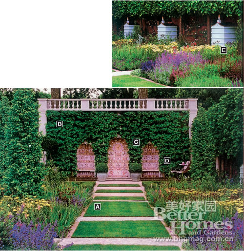![]() 5.優雅繁花,典型老英國范兒 設計師羅伯特·梅耶的作品最具有典型的英國風格。這是一個為英國老牌百貨商店Fortnum&Mason準備的庭院美化方案,充分展現了梅耶所想要表達的古典優雅氣質,并且非常適用于裝飾空間有限的小廣場。在寸土寸金的倫敦,這一點顯然也具有重要意義。 A.廣場中央規整的對稱設計使草坪看起來像一塊塊聯結好的臺階,一步步將你引向設計師準備好的花叢中觀賞美景。 B.在庭院的盡頭、楓香樹挺拔傲立,仿佛自然設施的圍墻。兩旁的石坊用欄桿聯結,更增添了庭院中的古典風情。 C.石坊下有三個用貝殼和鵝卵石壘成的員工門,凸顯了舊日英國引人入勝的田園風情。三個圓拱門在密密麻麻的綠色攀緣植物的掩蓋下,平添了幾許神秘的味道。梅耶在設計這三道拱門時,只賦予了它們裝飾作用,而沒有讓它們承擔真正的聯通功能。 D.花徑兩旁的石灰巖臺階為游賞的人們提供了充足的休息場所。庭院中的水池和噴泉周圍有黃楊木環繞,草坪蜿蜒通向可供休息的石階。 E.滿目的繁花將這片庭院打造成了蜜蜂們的樂園。靈動的精靈在花徑間穿梭往返,為庭院增加了幾許生氣。多種植物在這個小型生態互動空間中形成了一個自然健康的循環體系。