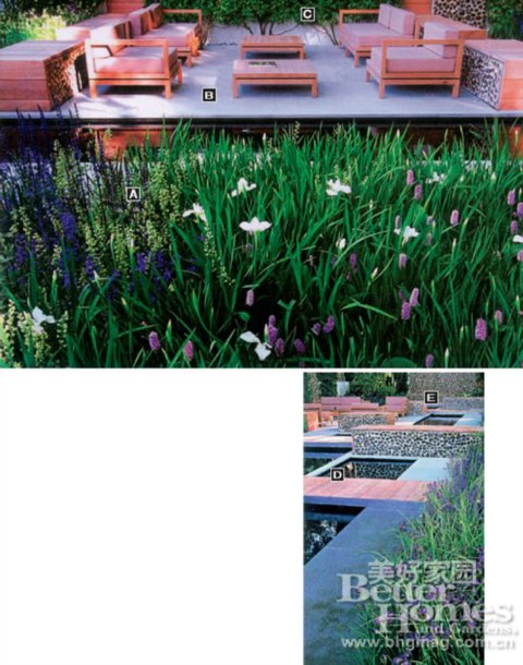 B.庭院中線條平滑的木制家具由菲利普·尼克松設計。出于防水角度的考慮,地面的木地板下方鋪了一層灰色的大理石作為隔離。