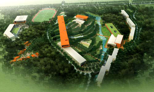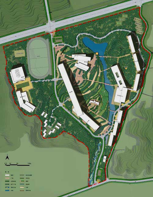 類別:校園與科技園 規模:24.7公頃 地點:遼寧沈陽 特色:該項目位于沈陽市棋盤山風景區轄域內,東靠沈陽世博園,南臨沈陽的母親河――渾河,地理位置優越。場地三山環抱,北高南低,中部地勢較為平緩,以臺地為主,中部則保留有一條自然的沖溝,而西部山體主要為自然林地,宜作為校區的自然景觀背景。 方案特色: 一嶺探碧水二龍戲朱雀 1 一嶺探碧水二龍戲朱雀 蒼崖半環山匯流競成趣 場地地勢呈現出兩翼山體環抱中央谷地的態勢。其中西側山體一直延伸至沈撫公路,直指渾河,同時,一條沖溝蜿蜒南下,由兩山之間延伸至場地南入口。綠色的山體呈現半環狀,山間的若干沖溝向下匯集,野趣盎然。 方案設計完整的保留了場地獨特的格局。主要建筑依山而筑,圍合中央谷地,使之成為未來校區主要活動空間,同時將沖溝加以利用,使之成為校園景觀廊道。 2 層綠依山形臺地師自然 回路外作環筑屋互成院 校區主要戶外活動空間的設計師法自然,依托山形展開,使用現代的設計語言抽象表達山形,層層綠帶逐漸跌落。 道路規劃利用原有的校區道路,設計環路串起各個功能區。環路順地形展開,蜿蜒曲折,做到通而不暢,有效降低車速,保證學生安全。建筑亦遵照整體景觀格局,即通透又有圍合感。 3 近水聽笑語跨溪聞書聲 柔情可比水剛直自有形 場地中部的沖溝被充分利用,設計為沿山跌落的水體,主要的活動空間皆近于此。于教學辦公區一側東望,生活區的笑語不絕于耳,于生活區一側西眺教學辦公區則書聲入耳。山水自然,建筑剛直,相互襯托,相映成趣,既有鐵骨又不乏柔情。 4 南眺盡雙眸北望隱深林 內能懷山水外可安四方 從校園南側向渾河方向望去,視線開闊,一望無際,而由北側入口望校區,建筑多隱于山林間。公安司法學院內懷山水,外安四方的意境,油然而生。