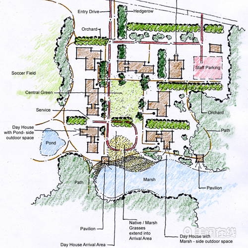 該項目將景觀作為有機元素,灌木籬墻、果園與草坪將該中心的各個區域有機的聯系在一起,構成一道亮麗的風景,同時還故意設計了一些有臺階的小路,以鼓勵殘障人士探詢大自然的勇氣。
