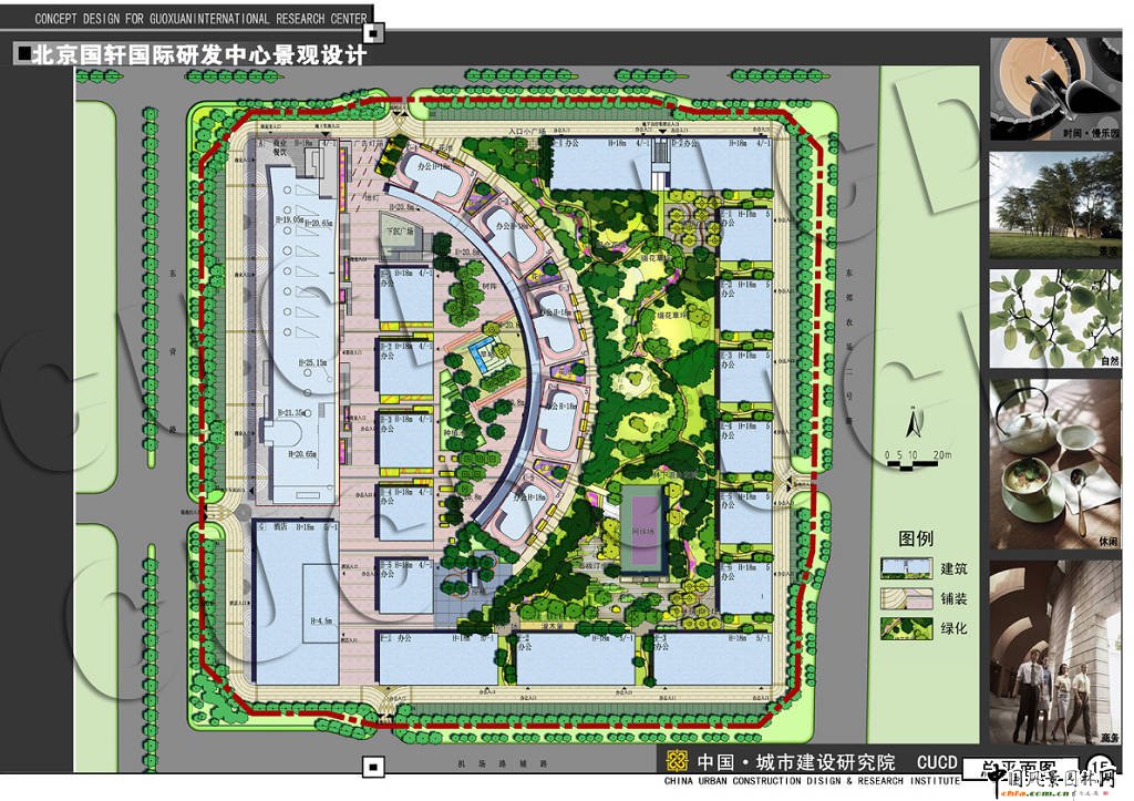 中國風景園林網訊 北京國軒國際研發中心(下稱國軒)位于朝陽區北皋,機場高速路沿線。在機場路輔路北側原朝陽區東郊農場。東接東郊農場二號路,北承三號路,西臨東營路。全園占地7.0公頃,包含園林綠地3.5公頃。現狀為空地。規劃場地中有商業、酒店以及五個辦公組團。庭院的設計定位是:滿足中檔商業及酒店、綜合辦公區域的園林景觀要求。 概念解析:繁忙的現代都市生活,給人們帶來了無限的壓力。人們緊張、焦慮,各種負面情緒由于"快"的生活需求紛至沓來。這中間,庭院傳遞給人們的是一種與"快"樂相互對應的,被人們長期忽視而又從新被認知的"慢"樂。 由國軒的名稱入手,遵循以人為本的設計原則,給即將進駐國軒的業主設計的環境是,"開軒面場圃",品味的是 "把酒話桑麻"的一種慢樂心態。這里有"蔓蔓日茂"的樹林草地,業主在慢條斯理的游園節奏中輕歌曼舞,品味浪漫情懷。這也是慢·樂園的設計理念和宗旨。根據不同人群的不同需求,該方案將庭院各部分功能為安靜休息、休閑娛樂、運動健身、庭院觀賞四個區域。 ![]()
