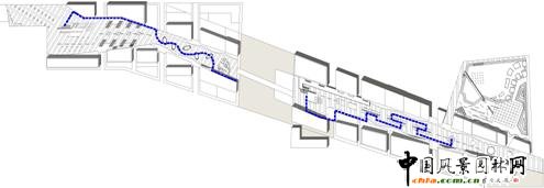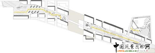 五 設(shè)計(jì)概念 1. 總體概念 GBD藝術(shù)區(qū)的一個(gè)重要的概念就是"雜"。1.內(nèi)容雜--GBD在時(shí)間維度中顯示出繁雜。在同一街區(qū),不同時(shí)間被不同人使用。我們希望看到的是:早晨居民在此遛狗、吃早餐,接著寫字樓的白領(lǐng)來(lái)了,商業(yè)場(chǎng)所的員工來(lái)了,購(gòu)物者觀光客來(lái)了,到了中午藝術(shù)家開(kāi)始出現(xiàn)在這里(這是他們通常的起床時(shí)間),下午影視公司的模特明星開(kāi)始穿梭,觀看演出的人來(lái)了,到了晚上本地人將來(lái)此地享受夜生活。這樣繁雜的時(shí)間使得GBD呈現(xiàn)自身的不為固定的作息變化。2.空間雜--GBD在空間維度中顯示出混雜,街區(qū)有密的路網(wǎng),各街區(qū)混合多功能。3.雜糅的策略。 我希望將這個(gè)"雜"的概念同樣滲入園區(qū)的景觀設(shè)計(jì)中,呈現(xiàn)景觀元素,材料,空間的多元化混雜,但這眾多的個(gè)體之間又存在內(nèi)在或外在的聯(lián)系,他們通過(guò)被我稱之為"線"的景觀要素和地標(biāo)構(gòu)筑物連接起來(lái)。并且在主題,形式和材料上形成呼應(yīng),空間上形成對(duì)比,從而表現(xiàn)出其內(nèi)在的聯(lián)系。保證設(shè)計(jì)的雜而不亂,雜而有序。 2. 具體設(shè)計(jì)概念 ![]() ![]() 三線串聯(lián)和跳動(dòng)的軸線是GBD藝術(shù)區(qū)的兩個(gè)重要的設(shè)計(jì)概念。 ![]() 光線--由條狀地?zé)艉颓鸂钭谓M成的線形光帶。水線--由水池引出的水渠,交通區(qū)域覆以金屬網(wǎng)以方便通行。景觀構(gòu)筑物線--由景觀地標(biāo)構(gòu)筑物不斷發(fā)展演變而成的線形景觀系統(tǒng)。三條線在整個(gè)設(shè)計(jì)中貫穿始終,相互交織相互聯(lián)絡(luò)呼應(yīng),將各個(gè)空間節(jié)點(diǎn)有機(jī)的連接起來(lái),從而保持了景觀序列的連續(xù)性而又不失變化。 三條線除了起到觀賞,連接引導(dǎo)作用在外,還形成了步行街的景觀主軸。這個(gè)軸線不是生硬的絕對(duì)對(duì)稱的,而是由景觀元素錯(cuò)落有致的分布在中心軸線兩側(cè)。給人以跳動(dòng)的感覺(jué),故稱作"跳動(dòng)的軸線"。 軸線上的主題空間--水空間,植物空間,光空間,城市霧林,天空的CD,它們分為動(dòng)態(tài)和靜態(tài)空間,按照動(dòng)--靜--動(dòng)--靜的排列方式有三條線串聯(lián)起來(lái),曾強(qiáng)體驗(yàn)的跳躍感和新鮮感,在路線上給人驚奇。 水空間的營(yíng)造主要靠金屬水幕架和噴泉方陣。孩子們可以進(jìn)入噴泉陣?yán)锿嫠#坝^與行人產(chǎn)生互動(dòng)。重要的"光線"從這里發(fā)起穿過(guò)綠籬帶同地標(biāo)樹(shù)池歸于軸線上。道路兩側(cè)的藍(lán)色地?zé)魩В捎貌AУ責(zé)艉褪慕惶娌贾茫渫鈩t是金屬材質(zhì)的框架與其它鋪裝明確劃開(kāi)。并設(shè)有種植池和黑色大理石條凳。人們可在此享受林下的舒適。夜晚打出藍(lán)色的光與黃色的光線形成絢麗的夜景。 植物空間是三線交織的典型區(qū)域,三條線在這里穿插滲透既打破軸線的完全對(duì)稱又能很好的保持其完整性.鋪裝也多次與整個(gè)設(shè)計(jì)形成呼應(yīng).在通行區(qū)域水線被金屬網(wǎng)覆蓋,以保證交通順暢.運(yùn)用減少障礙加強(qiáng)聯(lián)系的概念方法,雜而不亂,雜而有序的組織空間. 光空間為動(dòng)空間,為了強(qiáng)調(diào)空間的互動(dòng)性,除了彩色的燈柱陣外,在池邊安置了一排反射燈,光線從燈柱中射出反射在鏡面上再射向水池然后再次反射向白色墻面,形成水波粼粼的影子,趣味性很濃。光線,水線,構(gòu)筑物線再次由分開(kāi)到交織。與建筑二層相連的平臺(tái)設(shè)有咖啡座,帶給人立體空間體驗(yàn)。 藝術(shù)區(qū)的露天廣場(chǎng)設(shè)計(jì)成下沉式的以便明確的限定空間,人們可以坐在臺(tái)階上休息和觀看表演。為了避免臺(tái)階過(guò)長(zhǎng)而產(chǎn)生過(guò)于生硬的感覺(jué),部分臺(tái)階用嵌于臺(tái)階上的草坪帶和波浪形花池打斷,并且能給人們創(chuàng)造視覺(jué)和心理上的停留點(diǎn)。在廣場(chǎng)與南側(cè)空間上架設(shè)景觀金屬橋,既劃分了空間又能提供立體的空間體驗(yàn)。 廣場(chǎng)上設(shè)置方格網(wǎng)旱噴,與廣場(chǎng)鋪裝和城市霧林的方格網(wǎng)結(jié)構(gòu)形成呼應(yīng)。廣場(chǎng)入口再次點(diǎn)綴地標(biāo)構(gòu)筑物--斜方柱。其以斜向方格網(wǎng)插入建筑旁樹(shù)池中,好像是從地里生長(zhǎng)出來(lái)的。其上可以點(diǎn)綴植物。整個(gè)空間設(shè)計(jì)處處呼應(yīng)聯(lián)系,看似元素雜而散,但卻又不可分割。與設(shè)計(jì)概念統(tǒng)一。 在公共空間中,影響人們行為的因素有很多。景觀構(gòu)筑,地面鋪裝,植物,水體等都會(huì)對(duì)其產(chǎn)生影響。在行走路線上布置樹(shù)陣,噴泉,水池,下沉廣場(chǎng)等會(huì)使動(dòng)態(tài)行為空間和靜態(tài)行為空間相互轉(zhuǎn)換。例如在靜態(tài)行為空間中,人們需要獲得"停駐位置"才能進(jìn)入停駐狀態(tài)。這就要求通過(guò)對(duì)景觀設(shè)計(jì)地形的處理,視覺(jué)焦點(diǎn),配套設(shè)施等環(huán)境的支持來(lái)達(dá)到目的。如果開(kāi)放空間缺乏邊界,或是邊界缺乏細(xì)節(jié),人們就很難找到地方停下來(lái)。在藝術(shù)區(qū)廣場(chǎng)的設(shè)計(jì)中,除了使