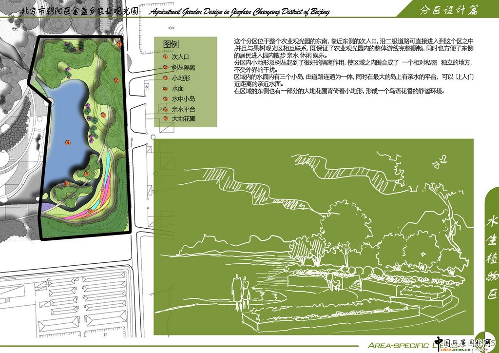 3.2. 7水生植物區 這個分區位于整個農業觀光園的東南,臨近東側的次入口,沿二級道路可直接進入到這個區之中,并且與果樹觀光區相互聯系,既保證了農業觀光園內的整體游線完整順暢,同時也方便了東側的居民進入園內散步 親水 休閑 娛樂。 分區內小地形及樹叢起到了很好的隔離作用,使區域之內圍合成了y一個相對私密 獨立的地方,不受外界的干擾。 區域內的水面內有三個小島,由道路連通為一體,同時在最大的島上有親水的平臺, 可以 讓人們近距離的親近水面。 在區域的東側也有一部分的大地花圃背倚著小地形,形成一個鳥語花香的靜謐環境。