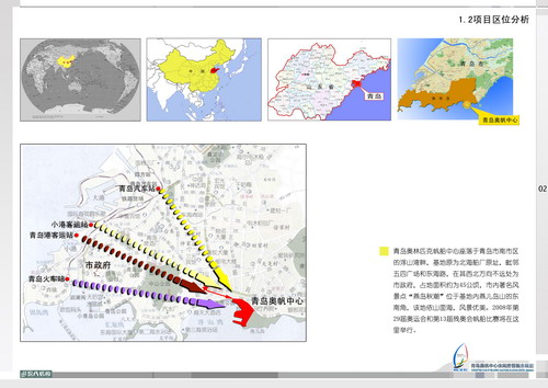 2.項目區位 青島奧林匹克帆船中心座落于青島市東部新區浮山灣畔,北海船廠原址,毗鄰五四廣場和東海路,占地面積約45公頃,市內著名風景點“燕島秋潮”位于基地內燕兒島山的東南角,該地依山面海風景優美。2008年第29屆奧運會和第13屆殘奧會帆船比賽將在這里舉行。