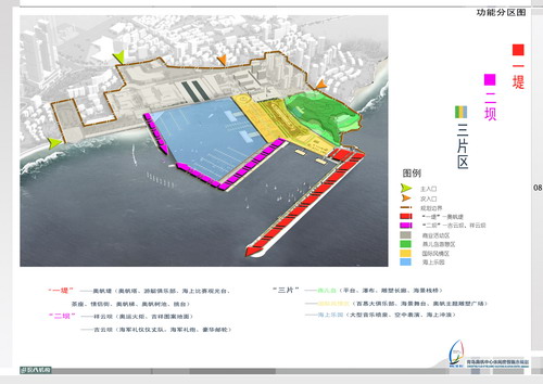 4.規劃總體創意及空間布局 規劃目標:以奧帆賽為契機,以實現“大旅游、大產業、大市場”為取向,把青島奧帆中心建成為國際一流的海濱休閑度假旅游目的地。 5.總體創意 定位: 國際一流海濱休閑度假5A級景區。 6.功能分區 根據奧帆中心各功能組團的現狀及未來發展要求,規劃提出將奧帆中心度假區空間劃分為“一堤二壩三片”的格局。 一堤——奧帆堤:人文奧運、浪漫情懷 二壩——祥云壩:祥云火炬、點燃激情 三片——燕兒島:休閑游憩、自然和諧 國際風情區:異國風情、中西交融 海上樂園: 海上娛樂、動感時尚 功能分區