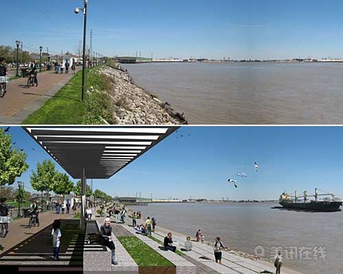 由Chan Krieger Sieniewicz,Hargreaves Associates, TEN Arquitectos,, Eskew+Dumez+Ripple領導的建筑師小組,在2007年2月公布新奧爾良密西西比河的最終設計。新設計的目標是縮小壁壘,讓人們享受河區(qū)生活,用公園和公共空間替換掉損壞的區(qū)域,從而觸發(fā)私人投資。