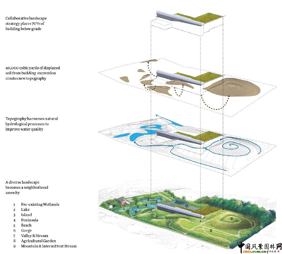 生態(tài)完整性: 通過對于生物工程方法的利用,新地形被穩(wěn)固住。場地內(nèi)的暴雨和建筑綠色屋頂上徑流的雨水流經(jīng)園景時(shí),得到充分的過濾。種植設(shè)計(jì)則利用了不需要肥料或殺蟲劑的當(dāng)?shù)仄贩N,減少了設(shè)備對下游的影響。植物的色彩設(shè)計(jì)也考慮了植物顏色和質(zhì)地的季節(jié)性變化,并預(yù)期隨著時(shí)間的推移,植物群落可以到達(dá)自然演化的程度。 在縮影中的流域: 景觀被設(shè)計(jì)成一處對于整個(gè)區(qū)域流域具有啟發(fā)意義的縮影。在被收集到一個(gè)可以補(bǔ)給地下水位的新池塘前,沼澤地引導(dǎo)著場地徑流流經(jīng)一系列獨(dú)立的景觀,包括農(nóng)田、草地和山谷等。曲折的小徑引領(lǐng)參觀者穿過園景,并引導(dǎo)他們思考水與土地是怎樣相互作用的。 社區(qū)使用: 當(dāng)公共設(shè)施被私有化,景觀和建筑并沒有忽視,而是主動地服務(wù)于臨近的居民點(diǎn)。這塊場地便也同樣服務(wù)于具有歷史意義的伊萊·惠特尼谷倉,被用作社區(qū)事件和規(guī)劃的場所。通過將從前平整的草坪轉(zhuǎn)變?yōu)閯討B(tài)的生態(tài)性多樣的公共場所,設(shè)計(jì)改進(jìn)了長期以來社區(qū)對于土地的利用,并且將場地與其所在的郊區(qū)環(huán)境結(jié)合起來。 項(xiàng)目資源: 景觀設(shè)計(jì),建筑設(shè)計(jì),土木工程師,結(jié)構(gòu)工程師,施工經(jīng)理,生物工程學(xué)顧問,景觀承包商 ![]()