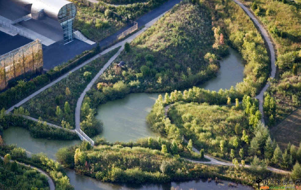 蜿蜒的水岸為動物群創造了一個更大、更豐富多樣的棲息地。茂密的藤本植物遮蓋了碼頭和服務區的構筑物。不透水的面層將坡面漫流收集起來。(點擊圖片查看大圖)