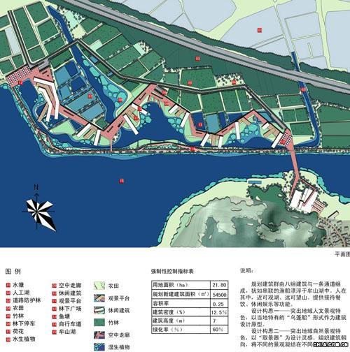 位于杭甬高速南側的現狀荒地處,建設集大眾餐飲、休閑、娛樂、觀光為一體的綜合性旅游休閑服務設施。建筑采用條狀空間布局,使旅游服務設施與自然環境融為一體。通過浮橋與竺山島相連,將竺山島上磚窯改造成整個牟山湖地區的制高觀景點。