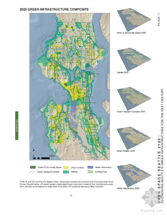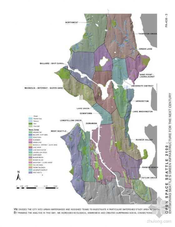 由景觀設計師發起的這一項目吸引了大批不同學科的專業人士參與,共同為西雅圖的綠色基礎設施做出長期規劃。從長遠及分析角度來看,這一項目革新了城市中按流域劃分的規劃單位,描繪出了未來的遠景圖畫,并且吸引了大量的投資。最終的規劃在靈活的多層次的GIS地圖中描繪出了全面的20到100年間的綠色基礎設施網絡,還提出了一個被城市所采納的可轉換的近期策略所用的框架圖示。
