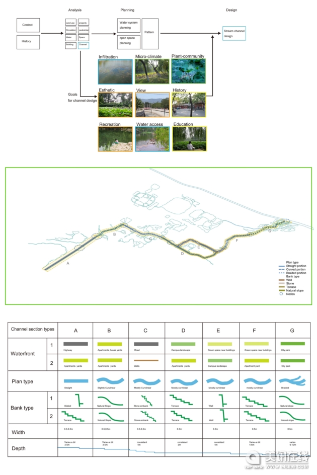 在水系統和規劃的濱水區類型的基礎上產生的不同河道類型。不同類型的河道在規劃類型、河岸類型、寬度和深度類型中被描述。