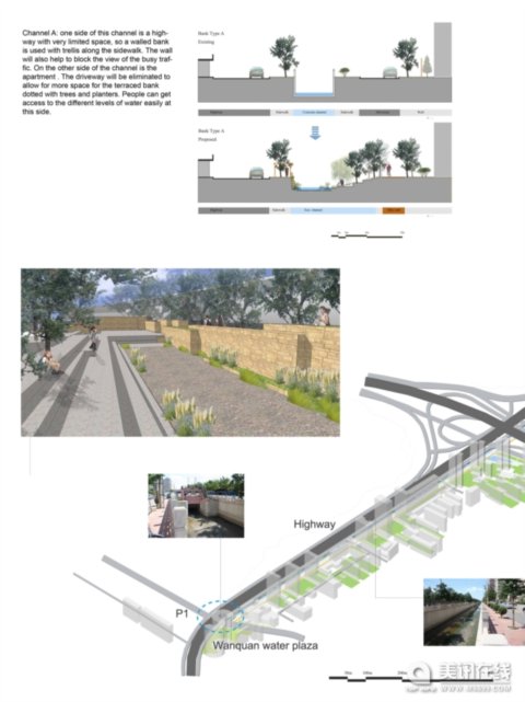 河道A區:該河道地段的一邊是一條空間有限的高速路,因此沿著人行道建造了一個帶有圍墻的河岸。河道的另一邊是一個公寓,而車道將會被改造以產生更多的空間,在這里將建造梯形的河岸平臺,上面會種植樹和其他植物。