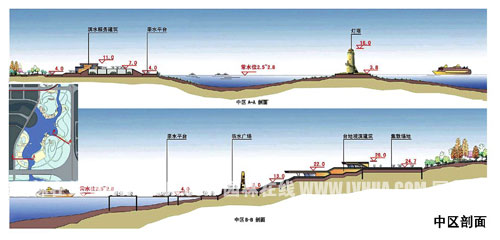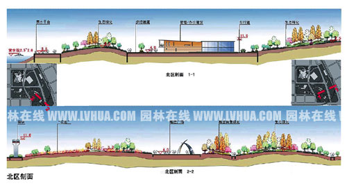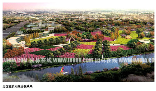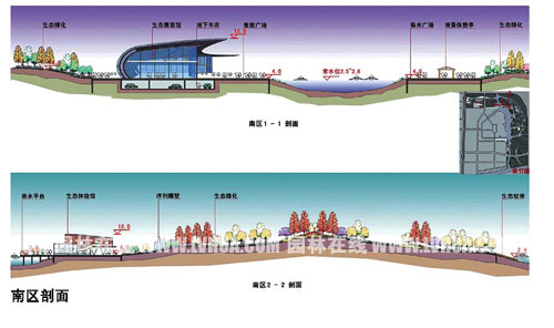 三、項目處理亮點列舉 (一)原有苗木處理 基地原為耕地.大規模種植苗木,量多面積大,對本項目的地形營造、水系開挖、景觀安排有不小的影響。苗木的合理利用將大大節省工程開支.并可能有助于本項目景觀價值、生態價值最大化。 (二)水系處理特色 一方面,本項目的水系規劃尊重了原有的農田水肌理,適當減少了土方開挖。另一方面.依照藍線管理規定.使景觀湖泊既不影響已劃定的河道藍線,又保證湖泊大小,形成和諧統一的水系統。 (三)主題詮釋 綠地被道路隔離的三塊區域,分別詮釋了本土化特色、現代時尚風潮,城市生態家園三層涵義,既滿足綠地多元詮釋.又通過園路系統、水系統等統一規劃,令綠地分而不散。 (四)相鄰道路節點處理 本項目相鄰市政道路與綠地的融合處理方式.是對部分區域進行適度擴大。不僅打開了景觀視廊,也為區域構建了連續的步行系統。 四、規劃主題 森蘭水岸、綠色演繹、時尚風潮 (一)森蘭一核心商務區 水岸一文化休閑黃金水岸 一與森蘭商務區呼應有效利用黃金水岸 (二)綠色一回歸自然的懷抱 演繹一未來新生態城市主義和諧發展 一全新的景觀綠地整合開發模式 (三)時尚——嶄新的景觀、文化、生活詮釋 風潮一時代潮涌、水娛樂文化潮 —全新的濱水、水上娛樂文化風潮 五、功能定位 北區:傳統文化體驗——以中國傳統的園林、曲藝文化為背景,結合原有寶蓮庵,牡丹園等景點,營造市民交流、健身的新城市公園。 中區:濱水娛樂休閑——滿足森蘭商務區多元訴求,安排濱水觀演、水上運動,戶外健身等大眾娛樂活動;同時結合濱水度假會所等高端娛樂活動,提升綠地及區域活力。 南區:生態體驗——為高檔屆住區提移姑}意棲居的周邊環境,營造集自然生態、旅游.體育休閑為—體的瓤圳糯地功能區。 六、分區規劃設計 (一)北區 區位分析:地塊西,北皆為居住區,西南主要是商業金融區域。東臨主干道楊高北路,南臨主干道洲海路,蘭谷路貫穿地塊南北。 特色構思:北區的重要主題即圍繞牡丹園.寶蓮庵演繹古典情懷,借寶蓮庵的人氣帶動牡 丹園內的曲藝活動.發展為集宗教、戲曲文化休閑于一體的雅趣之所。同時兼顧為居住區服務的市民健身,以及為商務區服務的森林辦公功能。主要亮點為森林辦公管理區域的艷麗花田景觀效果(輕軌俯視):庵,花園的古典雅致。 (二)中區 區位分析:區塊西鄰規劃中的森蘭商務區.將為商務區提供多元化的休閑娛樂活動和景觀環境。該區塊位于綠地中心,是全區的高潮和精華部分。 特色構思:休閑娛樂區是一系列小型景觀服務建筑和碼頭區域的集中所在。風情碼頭區塊是中區的主要交通出入口與游客集散中心.親水地帶正對濱水演藝中心,是最佳的觀賞區域。濱水演藝區作為森蘭酒店區的對景區域.以營造大氣簡約的風格為主。大地景觀區以獨特的地形營造和對比強烈的綠化色塊,形成過目難忘的大地雕塑藝術品。防護林帶區內密植常綠喬木與色葉喬木.對沿路的高壓線進行視覺遮蔽。 (三)南區 區位分析:生態濕地區位于楔形綠地的南端,今后將是西側高檔居住區的相鄰綠地,是在原有的農田、河網基礎上新建的一片生態濕地,展現的是自然的水陸交界景觀。 特色構思:采用生態濕地模式,將原有河道進行拓寬和整理,形成新的濕地河網系統。在外圍高壓走廊帶通過地形和綠化構建森林防護區;中心構建生態核心區,核心區形成內部步行交通體系,減少外界對濕地核心區的影響:在地塊南側構建生態休閑運動區,為游客提供娛樂休閑活動。