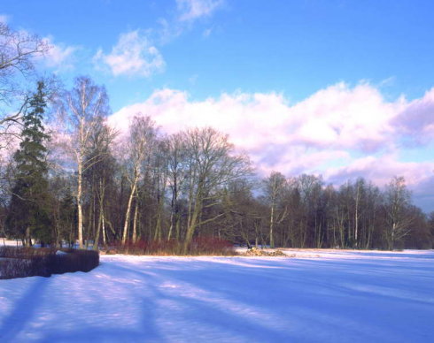 巴普羅夫斯克在皇村的附近,據(jù)說(shuō)有30平方公里之大,是葉卡捷琳娜二世的兒子保羅的領(lǐng)地,也是他的守獵場(chǎng),因?yàn)槭轻鳙C場(chǎng),所以它保持了俄羅斯大自然的美貌,我們?nèi)サ哪翘欤泌s上晴天,在藍(lán)天白云的映照之下,約一尺厚的積雪也發(fā)出幽幽藍(lán)光,配以一望無(wú)際的大森林,小溪,原野,英式古亭…怎能不讓人心動(dòng)?看到這些,我回憶起我原來(lái)很喜歡用手風(fēng)琴拉的一首蘇聯(lián)歌曲“士兵圓舞曲”: