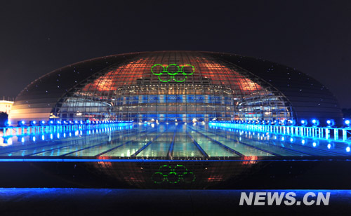 8月2日晚,激光打出奧運五環標志的中國國家大劇院在景觀照明燈的映襯下顯得分外迷人。新華網 文濤 攝