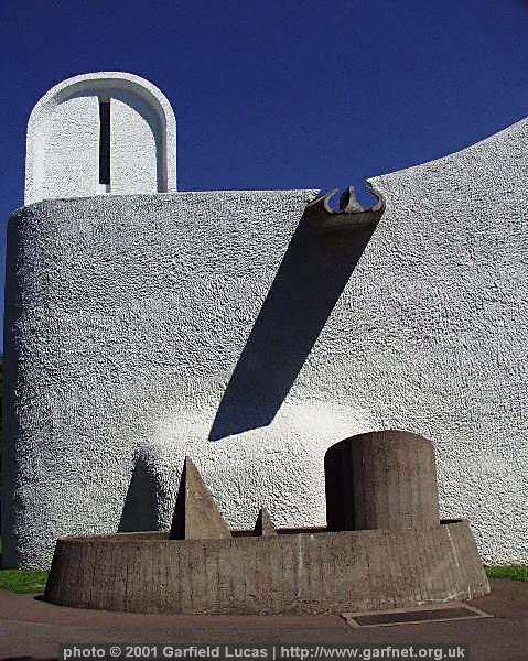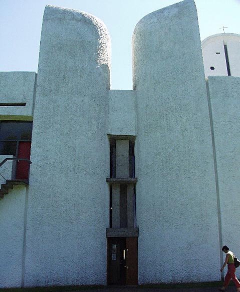 朗香教堂 朗香教堂是現代主義建筑中最具影響力的作品之一,也是著名建筑師勒·柯布西耶的里程碑式作品。自從1945年它首次對公眾開放以來,朗香教堂已經成為建筑師、學生和旅游者前來朝圣的圣地。這座著名的建筑坐落在法國東部毗領瑞士邊界附近的一座小山頂上,取代了在第二次世界大戰中被毀的以前的教堂。 這是一座位于群山之中的小小天主教堂,它突破了幾千年來天主教堂的所有形制,超常變形,怪誕神秘,如巖石般穩重地幾立在群山環繞的一處被視為圣地的山丘之上,朗香教堂建成之時,即獲得世界建筑界的廣泛贊譽它表現了勒氏后期對建筑藝術的獨特理解、嫻熟的駕馭體形的技藝和對光的處理能力。無論人們贊賞與否,都得承認勒·柯布西耶的非凡的藝術想象力和創造力。 勒·柯布西耶接受這個重建朗香教堂的工程之后,采用了一種雕塑化而且奇特的設計方案。他突破了,于是好像是飄浮在墻面上一樣。南面的墻被稱之為“光墻”,這個墻體很厚,上面留有一些不規則的空洞,室外開口小,而室內開口大,比例奇特,靠外墻的部分裝上教堂里常用的彩色玻璃,同時,墻體和屋頂的連接并不是無縫的,而是有一定間隙的,她的三個弧形塔把屋頂的自然光引入室內,這些做法使室內產生非常奇特的光線效果,而產生了一種神秘感。主禮拜堂位于東面,這是符合基督教義的。這個禮拜堂可以容納50個人。 朗香教堂的屋頂東南高西北低,顯出東南轉角挺拔奔昂的氣勢,這個坡度很大的屋頂有收集雨水的功能,屋頂的雨水全部流向西北水口 ,經過一個伸出的瀉水管注如入地面的水池。教堂的三個豎塔上開有側高窗。它以一種奇特的歪曲的造型隱寓超常的精神。教堂要求簡單造價不高,是一個表意性建筑。 朗香教堂是二次世界大戰以后,勒·柯布西耶設計的一件最引人注意的作品,它代表了勒·柯布西耶創作風格的轉變,并對西方“現代建筑”的發展產生了重大的影響。