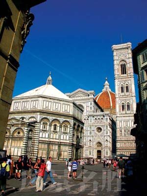 尤其值得一提的是這座教堂的大穹頂,這是世界上最大的穹頂之一。它是伯魯乃列斯基(Fillipo Brunelleschi,1379-1446)的杰作,高91米(僅比現代建筑中超高層的概念少不到10米),最大直徑達45.52米,在幾百年前從設計到施工可以說都是一個奇跡。進入教堂,爬經436級樓梯,通過狹窄的螺旋形階梯到達頂部,更可以俯覽整個佛羅倫薩。與穹頂相比,教堂的西立面則更呈現出一種活潑歡快的氣氛——普拉托的綠色、卡拉拉的白色及馬雷馬的紅色,來自三個不同地方的三色大理石也演變為今日意大利國旗的顏色。 主教堂及其穹頂是一個永遠的標志物。無論距離遠近,在任何街道,白天還是夜晚,它突出的輪廓和尺度都能給人一種特別的感動。 ![]()
