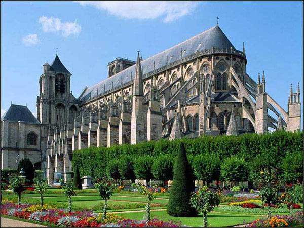 布爾日大教堂位于巴黎南部大約200公里遠(yuǎn)的地方。始建于1195年,歷時60多年才完工。與沙特爾大教堂一樣是第一批哥特式建筑,隸屬于同種風(fēng)格建筑中的佼佼者。與沙特爾大教堂形成鮮明對照的是,布爾日教堂是具有風(fēng)格獨特的、典型法國哥特式建筑的起點。唱詩班的席位于1214年完成,中心廣場于1225-1250年之間建成,但西面的正面建筑直到13世紀(jì)70年代才告竣工。北面的塔樓于1505年倒塌,1542年又得以重建。教堂設(shè)計風(fēng)格儉樸,兩個側(cè)面的走廊、兩個回廊,沒有教堂的十字型翼部。據(jù)說這種建筑風(fēng)格的靈感來自于巴黎的蘭斯大教堂。但教堂的內(nèi)部與蘭斯教堂的風(fēng)格迥然相異。中心廣場的面積幾乎同沙特大教堂的一樣大,15米寬,37米高。但是拱廊的高度達(dá)20米,這比沙特爾大教堂的高度要高出6米,因此在視覺上收到了更好的效果。由于沒有十字型翼部,廣場的空間獲得了側(cè)面的透視效果和緊湊感。 第一個回廊的天花板的高度是 21.3m ,第二個 是 9.3m。兩個回廊天花板高度的不同使得第二個回廊也能像第一個那樣修建三拱式拱廊和天窗。第一個回廊、小型化處理第二個回廊和中心廣場的空間構(gòu)成了獨特的金字塔空間形式。大門上粘貼的圖畫是"最后的審判"的主題畫。其后右側(cè)大門上的是"圣艾蒂安"主題畫,左側(cè)的是"圣母瑪麗亞"的主題畫。當(dāng)?shù)叵率疫處于建筑中時,還沒有制定修建后殿的計劃。當(dāng)?shù)叵率彝瓿珊螅蟮钜矊⒈唤ㄖR虼撕蟮钜蛟摵苄。⑶医ㄖ诘叵率业幕稀?/DIV> 布爾日大教堂尤以其設(shè)計協(xié)調(diào)和比例均衡而引人稱羨不已,它的門楣,雕塑和彩色玻璃窗特別引人注目,不僅僅具有建筑上的美觀性,大教堂的存在同樣顯示了法國基督教的權(quán)力性。 大教堂坐落在一個花團(tuán)錦簇的花園中,廳堂的四周環(huán)繞著間隔整齊的高大扶壁,格外引人注目。看起來仿佛是在騰飛跳躍。在歐洲的哥特式建筑中,布爾日大教堂堪稱其中的典范。