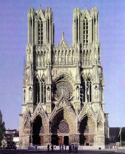 蘭斯主教堂 1211-1290年建,法蘭西國王的加冕教堂,主教堂內(nèi)設(shè)有主教座,每個教區(qū)只有一所。該教堂以形體勻稱、裝飾纖巧著稱。教堂前后建了百余年,由于墩柱形式與裝飾主題一致,格調(diào)統(tǒng)一。 法國盛期的著名教堂還有蘭斯主教堂和沙特爾主教堂,它們與亞眠主教堂和博韋主教堂一起,被稱為法國四大哥特式教堂。斯特拉斯堡主教堂也很有名,其尖塔高142米。 百年戰(zhàn)爭發(fā)生后,法國在14世紀(jì)幾乎沒有建造教堂。及至哥特式建筑復(fù)蘇,已經(jīng)到了火焰紋時期,這種風(fēng)格因宙欞形如火焰得名。建筑裝飾趨于“流動”、復(fù)雜。束柱往往沒有柱頭,許多細(xì)柱從地面直達(dá)拱頂,成為肋架。拱頂上出現(xiàn)了裝飾肋,肋架變成星形或其他復(fù)雜形式。當(dāng)時,很少建造大型教堂。這種風(fēng)格多出現(xiàn)在大教堂的加建或改建部分,以及比較次要的新建教堂中。 法國哥特時期的世俗建筑數(shù)量很大,與哥特式教堂的結(jié)構(gòu)和形式很不一樣。由于連年戰(zhàn)爭,城市的防衛(wèi)性很強。城堡多建于高地上,石墻厚實,碉堡林立,外形森嚴(yán)。但城墻限制了城市的發(fā)展,城內(nèi)嘈雜擁擠,居住條件很差。多層的市民住所緊貼狹窄的街道兩旁,山墻面街。二層開始出挑以擴大空間,一層通常是作坊或店鋪。結(jié)構(gòu)多是木框架,往往外露形成漂亮的圖案,頗饒生趣。富人邸宅、市政廳、同業(yè)公會等則多用磚石建造,采用哥特式教堂的許多裝飾手法。 ![]() 以設(shè)計協(xié)調(diào)和比例均衡而令人稱羨的布爾日·圣·斯蒂芬大教堂建于12-13世紀(jì),是杰出的哥特式建筑之一。它的門楣,雕塑和彩色玻璃窗特別引人注目,除了建筑的美觀性外,它還顯示了法國基督教的權(quán)力性。