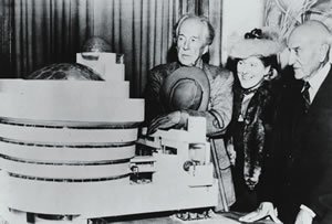 賴特向男爵夫人Hilla Rebay和Solomon R.Guggenheim展示他設計的古根海姆博物館模型。 在1958年,賴特已經90多歲了,他得到了31個全新的設計任務,這時他的設計桌上的項目總量達到令人驚訝的166個。而這一年,他還寫了《TheLivingCity》,同時他還監督Guggenheim的建設,這個工程直到他死后才完成。他在1959年為亞利桑那州立大學設計的大禮堂也是在他死后才完工的。在賴特一生中,共作了1100個設計,其中近三分之一是在他最后的十年內完成的。賴特有令人驚訝的自我更新能力并且在建筑設計上不知疲倦的努力工作,他創造了真正的美國式建筑。通過他的作品、他的著作和他培養的上百位的學生,他的思想被傳播到世界各地。