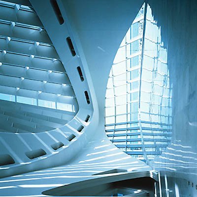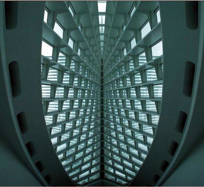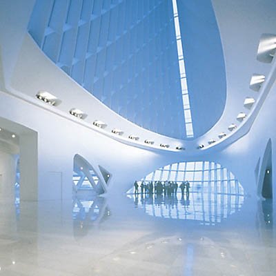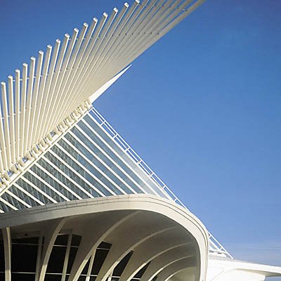 這個建筑無論放在什么地方,都一定是個絕色,別的建筑沒法兒和它比肩而立的。2001年由美國《時代》雜志評選的年度設計榜上,米爾沃基美術館被舉為頭名。此一排行榜不僅收羅了當年的新建筑,還包括家具、汽車、時裝設計乃至于電影的美工設計,可見行外的人們被它感動的程度。難得卡拉特拉瓦把爛熟的老式建筑材料鋼筋混凝土耍弄到了得心應手的程度,居然借此再把爛熟的結構審美推近了你的鼻子尖兒。有很久了,建筑師和結構工程師之間涇渭分明各司其職,而且,說心里話,有很多建筑師只把結構設計看成是不得不容忍的束縛和累贅,是我們戴著跳舞的枷。專業細分的行規多年來讓我們以為,我們只要靈光不斷如噼哧噗哧的打火機般就是本分了,讓房子立起來不倒,俗務罷了,留給結構工程師去算也罷。卻是忘記了,文藝復興的建筑巨匠們,會以結構想象力作為新創造的出發點。周遭所有相關的藝術和科學門類都為我所用,這樣的盛況本已難再,竟又意外地出現在新的世紀轉換點上,可不是讓人喜出望外?