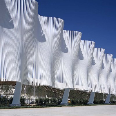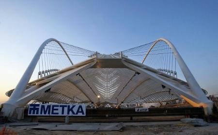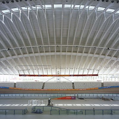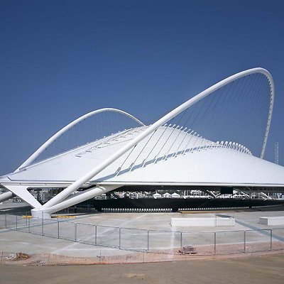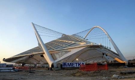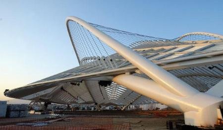 雅典奧林匹克綜合體育場 雅典奧運(yùn)主場館由已有二十年歷史的舊場館加建而成。由于奧運(yùn)會(huì)在酷熱的盛夏舉行,為了使大部份觀眾能舒適地欣賞比賽,把有蓋座位盡量增加成為改建的主要目標(biāo)。這項(xiàng)目由著名西班牙建筑師卡拉特拉瓦設(shè)計(jì),主要是在原場館上加上兩條長304公尺,高80公尺的大型拱梁,再用鋼纜拉起總面積超過一萬平方公尺,總重量一萬六千噸的纖維版屋頂。這能容納超過七萬人的場館改建之後,有蓋座位由35%增加至95%。和上屆悉尼奧運(yùn)當(dāng)時(shí)全新興建以空間構(gòu)架(Space Frame)為主結(jié)構(gòu)的場館比較,雅典場館雖然座位較少,但這拱梁和屋頂結(jié)構(gòu)的形態(tài),卻顯然有著歐洲式的優(yōu)雅。 奧林匹克體育館建筑群離市中心約5km,這里除了舉行奧運(yùn)會(huì)開幕式、閉幕式外還將舉行自行車、游泳等項(xiàng)目的比賽。卡拉特拉瓦稱此工程為“奧林匹克夢(mèng)想”,它將使有20年之久的老體育館發(fā)生翻天覆地的變化。兩只鋼穹頂將橫跨球場上方,半透明玻璃懸于座位區(qū)之上,可以讓陽光進(jìn)入又可以阻隔熱氣。卡拉特拉瓦希望這個(gè)有鋼、混凝土、看得見風(fēng)景且?guī)е诺渲獾慕ㄖ芙o人留下難忘的映象,并能激發(fā)出奧林匹克精神。卡拉特拉瓦說這個(gè)設(shè)計(jì)的靈感來自拜占庭建筑,穹頂、藍(lán)白基調(diào)源于愛琴海及其諸島。