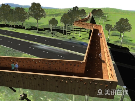 該項目的目的是建造一個與我們所熟知的大橋設計結構所不同的獨特的、更具人文關懷的人行橋,這不是給那些沒有私家車的人們做姿態,而是將他們的出行體驗優先定位,目的是避免建成一個不必要的、不可持續且無用的龐然大物。 設計師們為一般的行人以及散步休閑的人們提供了一個非常舒適的道路與一具大型景觀雕塑作品,該人行橋的設計是針對當前交通擁堵的狀況,并將這里與周圍的森林景觀聯系在一起。他們努力創建了一個具有獨特形象的場所,一個將車輛、行人、橋梁與鄉村環境結合在一起的焦點。從設計圖上可以看出,這是一個獨特的怡人空間,一個安全的人行橋,一個城市和地區的地標和港口,為城市的復興亮起了燈塔。因此,這是一個美麗迷人的場所,可以激發人們不斷在這里散步休閑。 設計有兩種元素構成:鋼結構的“樹木”與木板帶狀人行道,他們好像是天然的景觀一樣,只不過通過木架結構被抬高了。這個簡單、技術含量低的可持續人行橋在建造時盡量影響到周圍的森林。橋欄采用木材捆扎而成,橋面也為木板包覆的,并裝飾了一些葉形圖案,在晚上點亮時會閃閃發光。鋼結構“樹”架在了人行道的兩側,在晚上可以做路燈用,顯示了設菲爾德市的重工業城市特點,而橋將成為設菲爾德港口別具一格的新地標和象征。